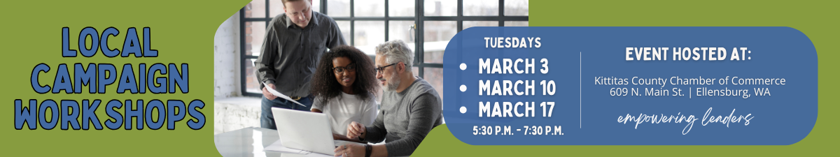 Kittitas County Chamber of Commerce local campaign workshops were created to help develop and train future candidates for public office. By enrolling in the workshops, you'll learn how to run an effective campaign. Enjoy a fast-paced evening class with high-profile leaders, thought-provoking topics, role-playing sessions, and practical tips and advice on all aspects of running a successful campaign.